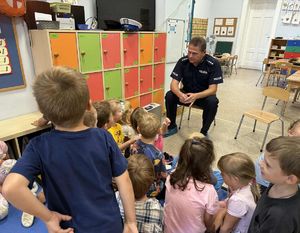 Dodano: 12.09.2025 Policjant sopockiej drogówki odwiedził przedszkolaków i rozmawiał o bezpieczeństwie -